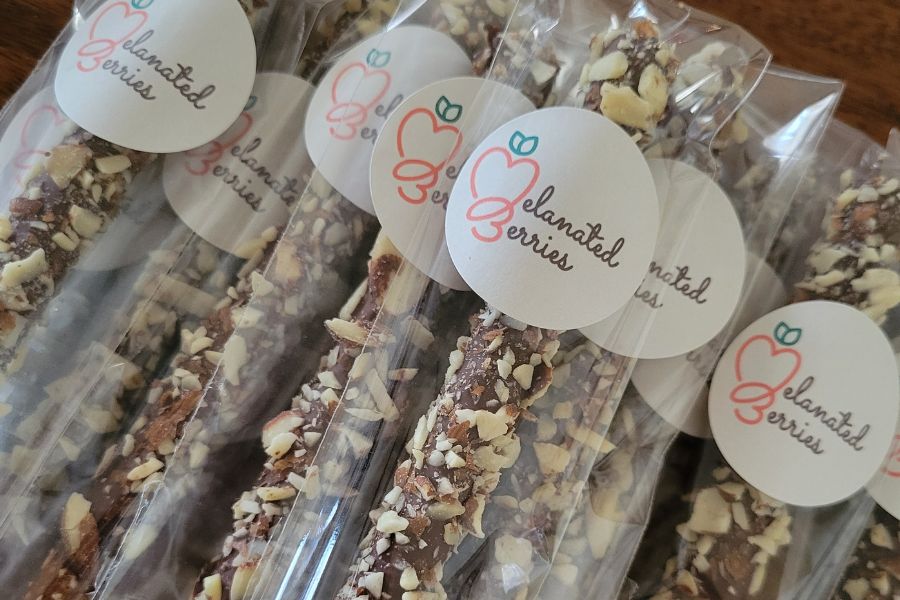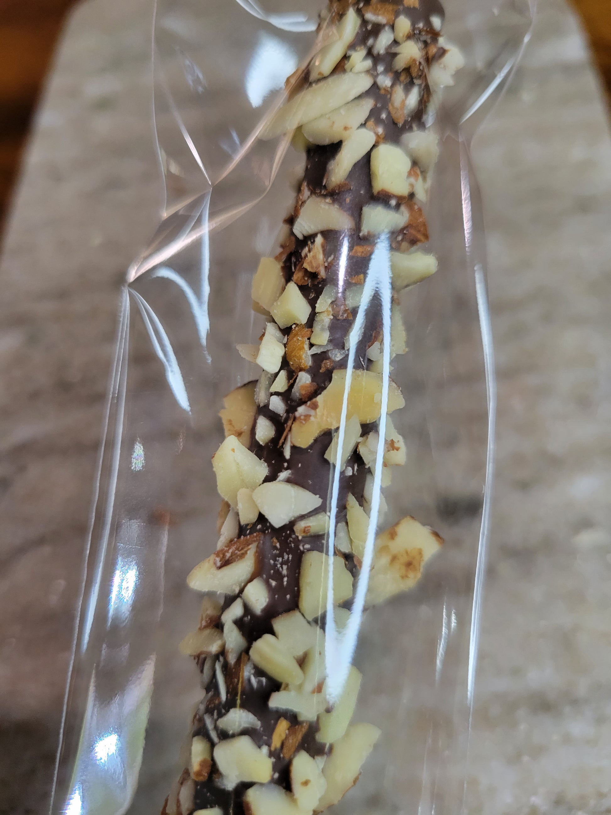 - Pretzel rods dipped in white chocolate with crushed almonds