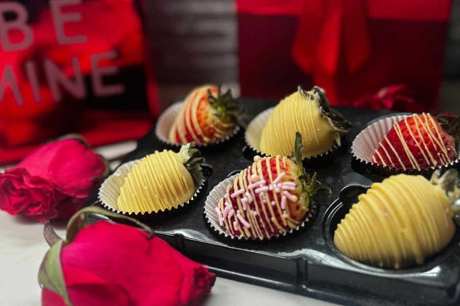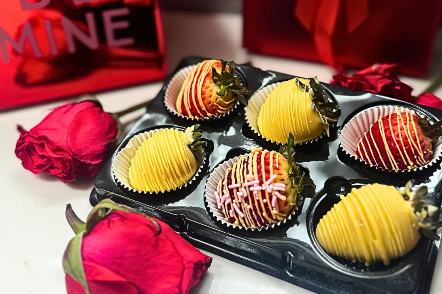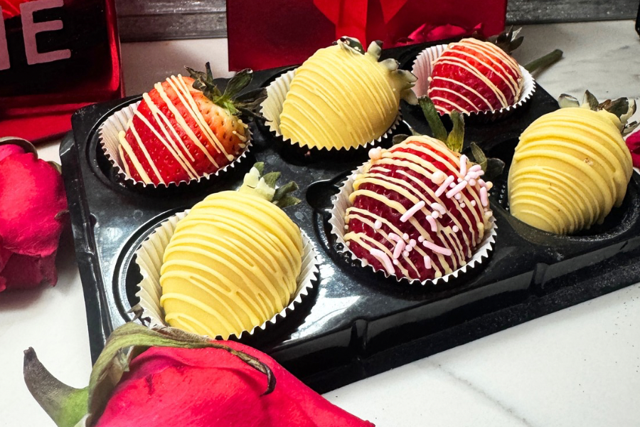 One dozen beautiful fresh strawberries enrobed in high quality white and dark chocolate