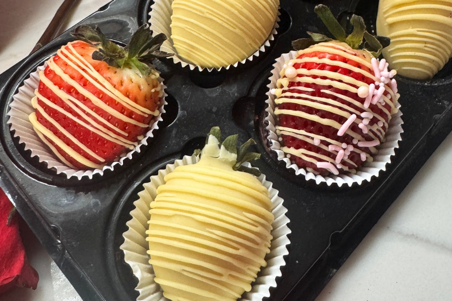 - Fresh strawberries dipped in white chocolate with white chocolate drizzle