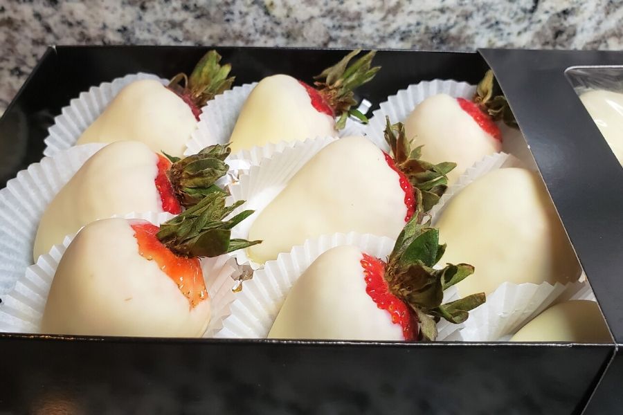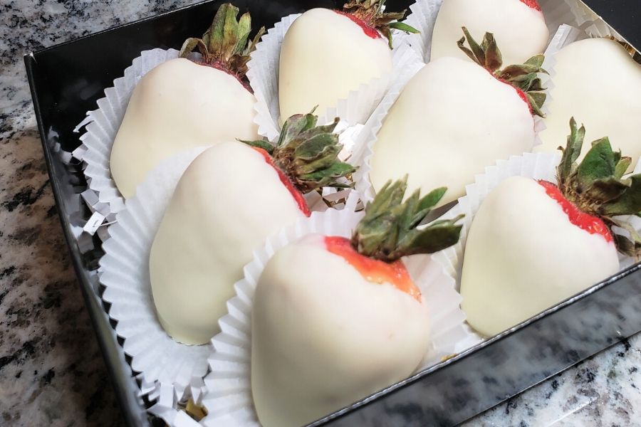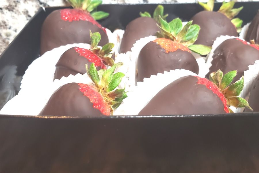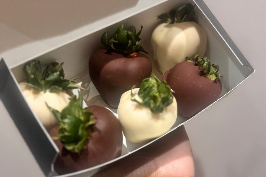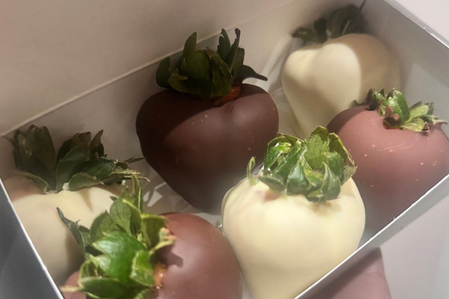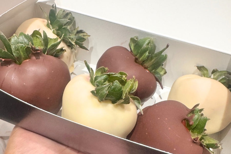 These exquisite gourmet chocolate-dipped strawberries are lovingly handpicked from your local South Carolina farmers during strawberry season. Each berry is thoughtfully coated in smooth vegan white chocolate or rich dark chocolate, crafted from the finest certified organic, Rainforest Alliance, Non-GMO, vegan, and kosher cacao. With cacao levels ranging from 48% to 72%, they offer a perfect indulgence for chocolate connoisseurs who value quality and care.