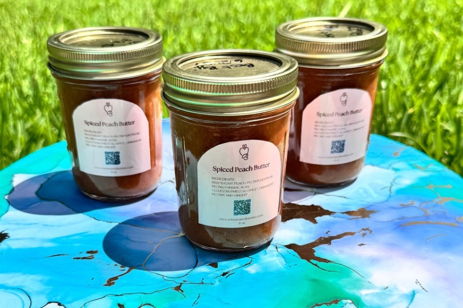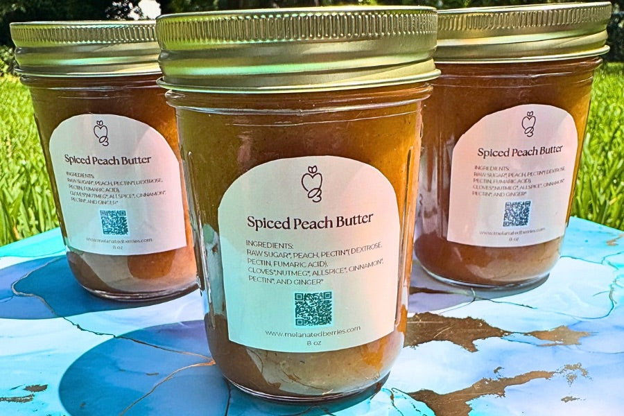 This delicious peach butter is a treat, perfect for the summer while peaches are the highlight of the season. The spices make it extra special with a little flare of FALL. This is the perfect spread for toast, sweet breads, toppings on pancakes and so much more. Get yours today!