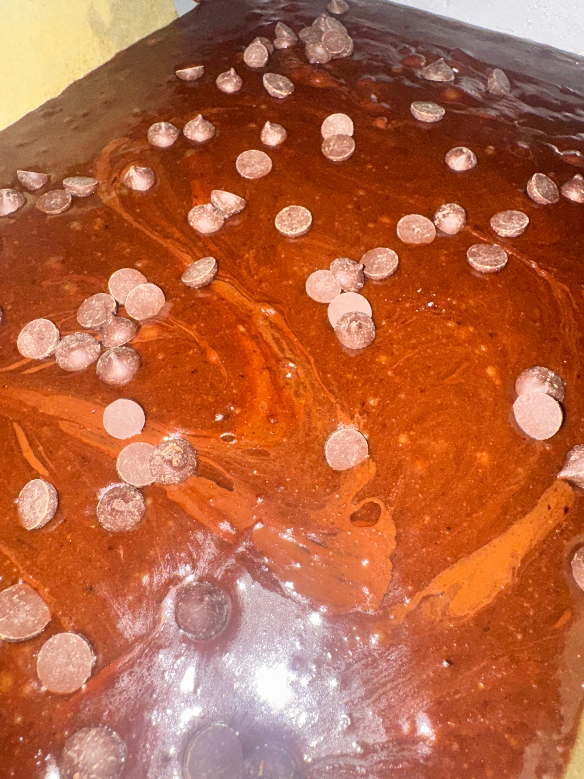Unbleached Flour, Raw Cane sugar, Cocoa powder, Vegan Chocolate*, Olive Oil*, Powdered Sugar*, Purified Water, Flax egg*, Vanilla extract*, and salt.
